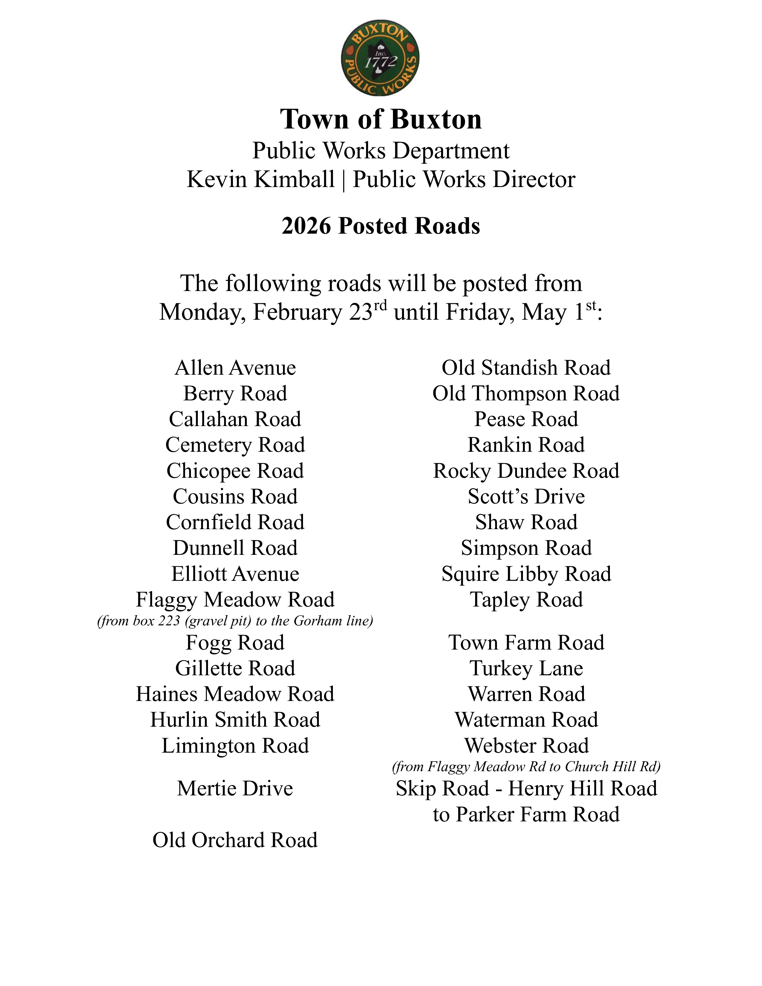 Every spring, roads are posted for weight restrictions to prevent road damage due to the spring thaw. Posted roads are marked with bright orange signs that list the maximum weight limit (usually 23,000 pounds).