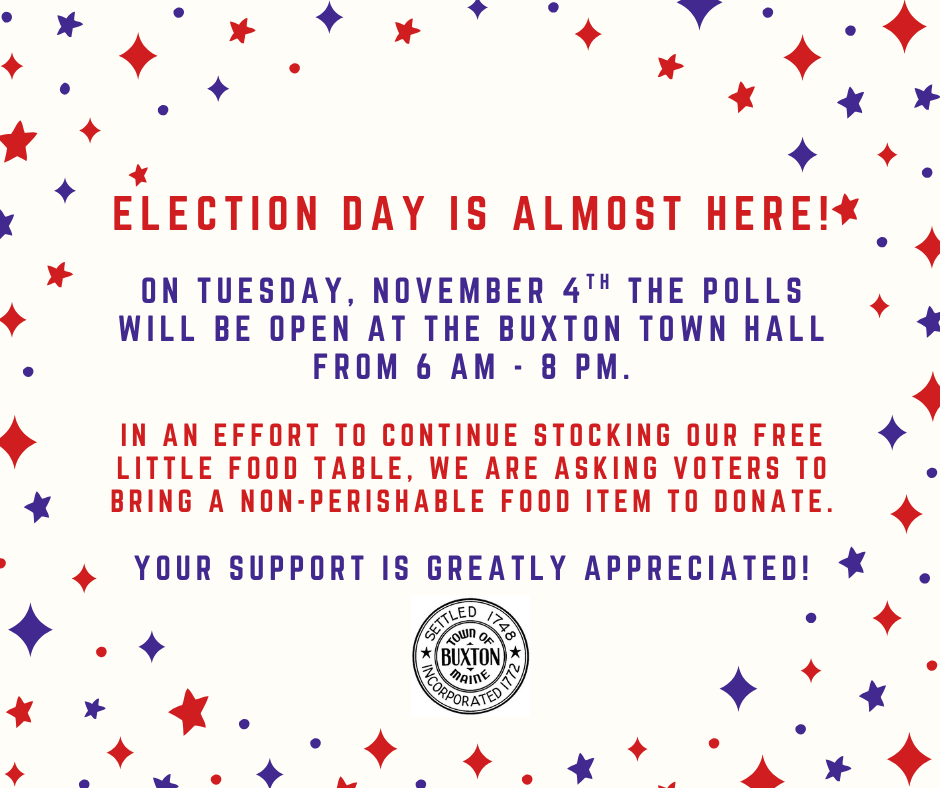 On Tuesday, November 4th the polls will be open at the Buxton Town Hall from 6 AM - 8 PM.