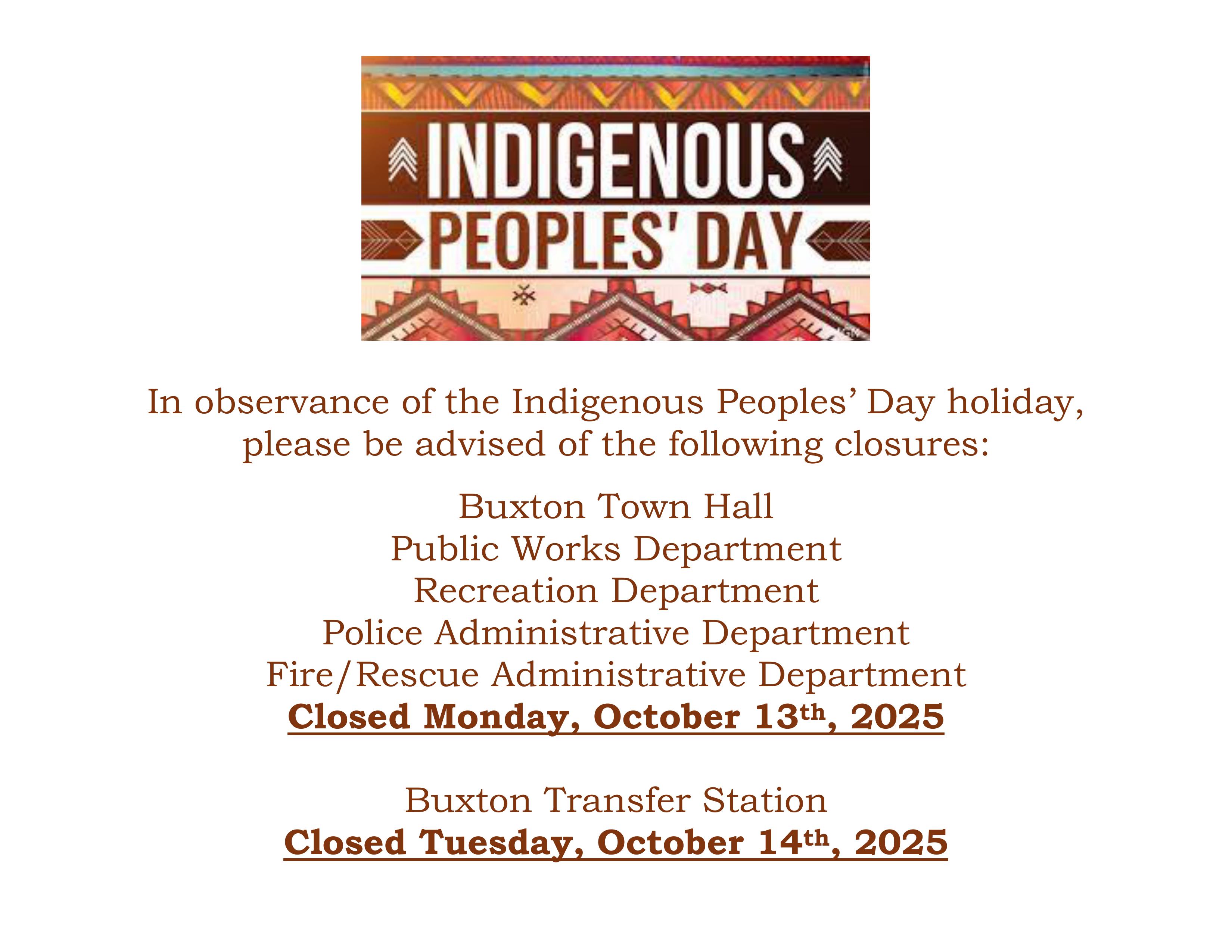 Buxton Town Hall will be closed on Monday, October 13th for the observance of Indigenous Peoples’ Day. The Transfer Station will be closed on Tuesday, October 14th.