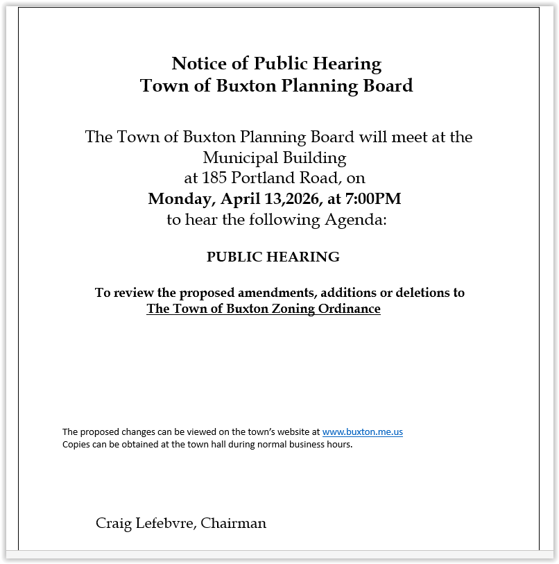 Notice of Public Hearing Town of Buxton Planning Board Monday, April 13,2026 at 7 p.m. March 24, 2026