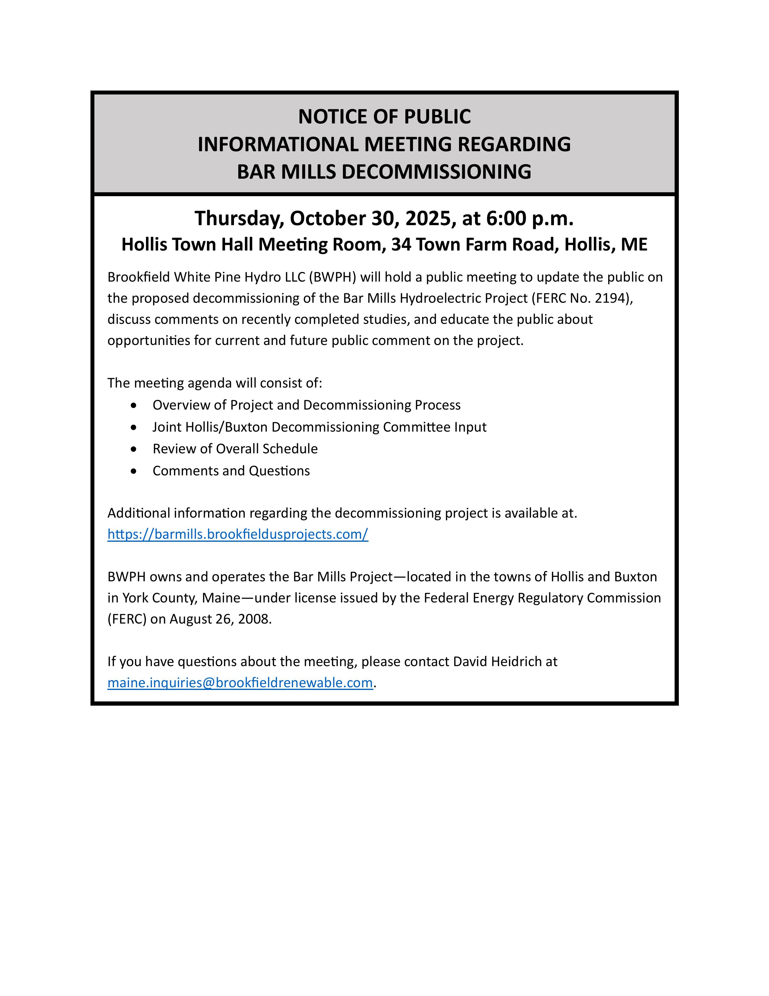 There will be a public informational meeting regarding the decommissioning of the Bar Mills Hydroelectric Project on Thursday, October 30th at 6 PM at the Hollis Town Hall Meeting Room. Please see the attached flyer for additional information.