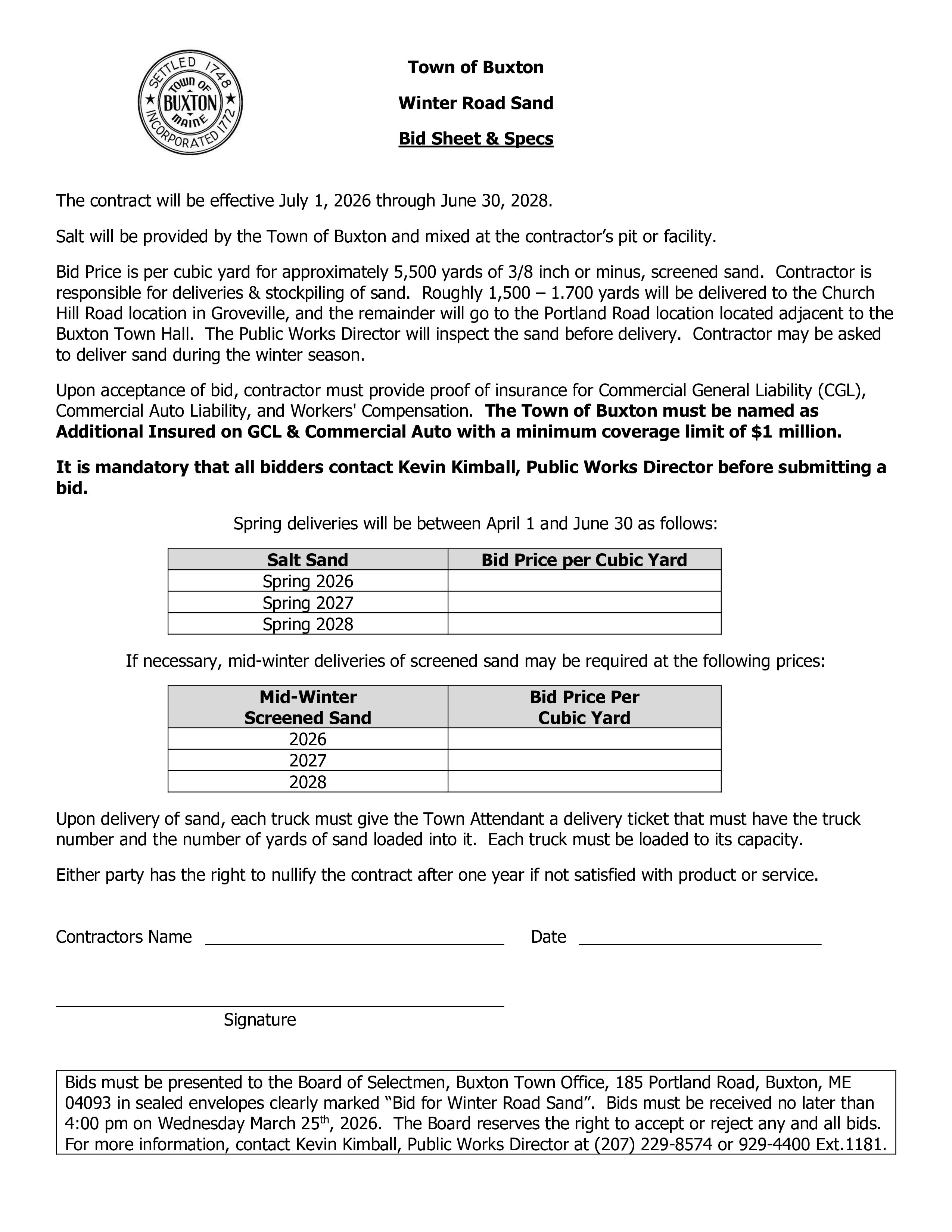 The Town of Buxton is soliciting bids for a three-year contract for winter road sand. Please see the attached documents for additional information.